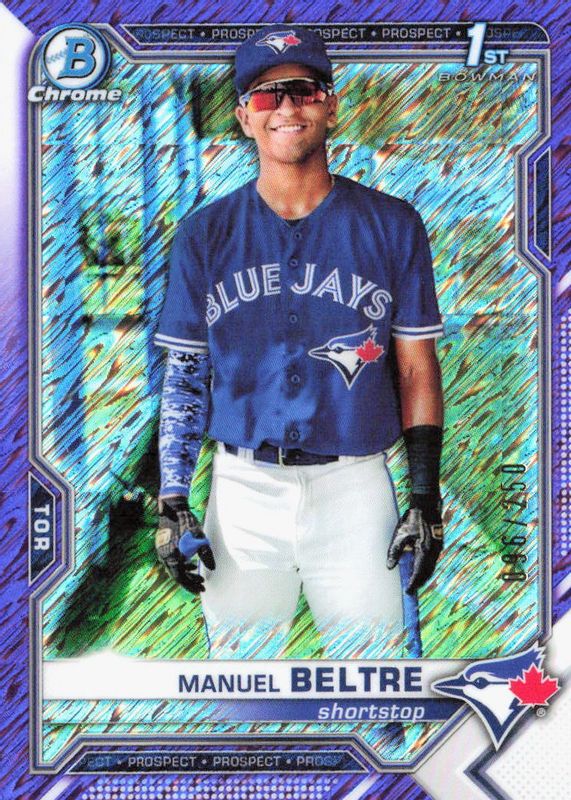 This card is 1 of 22 Manuel Beltre's card variations in the 2021 Bowman Chrome set being tracked by Sports Card Investor, including Prospects (1st), Prospects - Black & White Mini-Diamond Refractor (1st), Prospects - Shimmer Refractor (1st), Prospects - Refractor /499 (1st), and Prospects - Speckle Refractor /299 (1st).