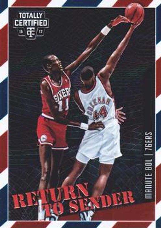 The Manute Bol 2016 Totally Certified #11 Return to Sender card is 1 of 10 Manute Bol's card variations in the 2016 Totally Certified set being tracked by Sports Card Investor, including Calling Cards, Return to Sender - Red /199, Return to Sender - Blue /99, Return to Sender - Orange /60, and Calling Cards Mirror /25.