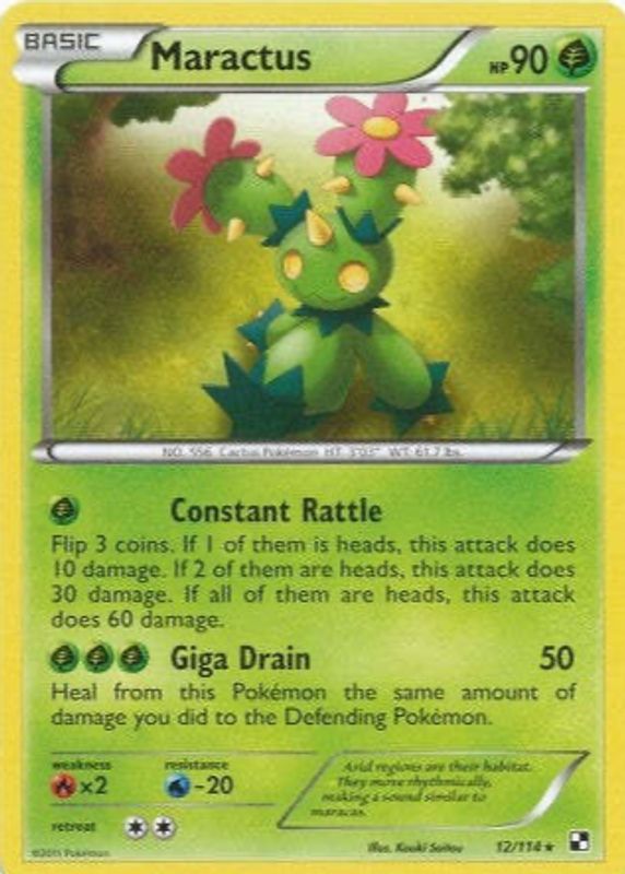The Maractus 2011 Black & White #012/114 Base card in Raw TCG (Lightly Played) condition has not changed in price in the last 30 days and was last sold for $1.49 .