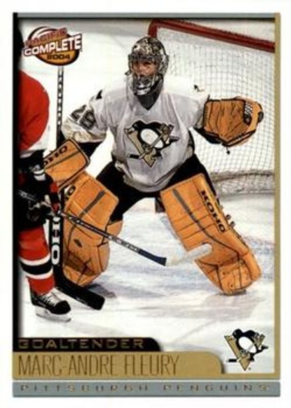 The Marc-Andre Fleury 2003 Pacific Crown Royale #507 2003 Pacific Complete Rookie card is 1 of 11 Marc-Andre Fleury's card variations in the 2003 Pacific Crown Royale set being tracked by Sports Card Investor, including Base /575, Retail /899, Red /5, 2003 Pacific Complete, and Gauntlet of Glory.