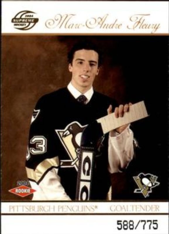 The Marc-Andre Fleury 2003 Pacific Supreme #133 Base /775 Rookie card is 1 of 5 Marc-Andre Fleury's card variations in the 2003 Pacific Supreme set being tracked by Sports Card Investor, including Base /775, Retail, Red /425, and Blue /250.
