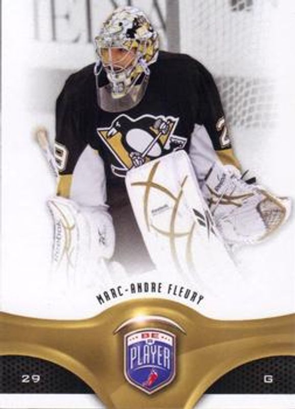 The Marc-Andre Fleury 2009 Upper Deck Be A Player #149 Base /99 card is 1 of 6 Marc-Andre Fleury's card variations in the 2009 Upper Deck Be A Player set being tracked by Sports Card Investor, including Player's Club /15, Sidelines, Signatures, Goalies Unmasked /499, and Autographs /10.