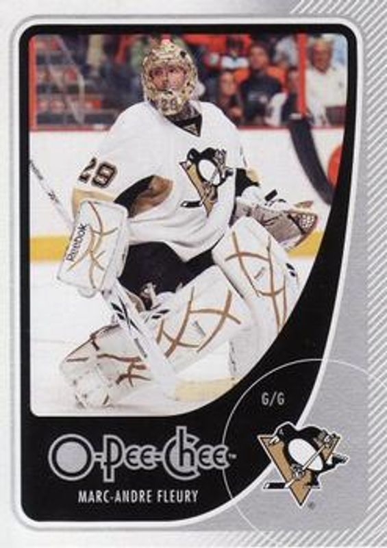 The Marc-Andre Fleury 2010 O-Pee-Chee #360 Base card is 1 of 6 Marc-Andre Fleury's card variations in the 2010 O-Pee-Chee set being tracked by Sports Card Investor, including Retro, Retro Blank Back, Retro Rainbow, Retro Black Rainbow /100, and In Action.