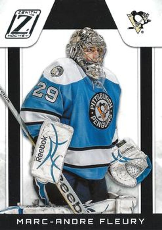 The Marc-Andre Fleury 2010 Zenith #41 Base /999 card is 1 of 5 Marc-Andre Fleury's card variations in the 2010 Zenith set being tracked by Sports Card Investor, including Red Hot, White Hot /25, Chasing the Cup, and Crease is the Word.