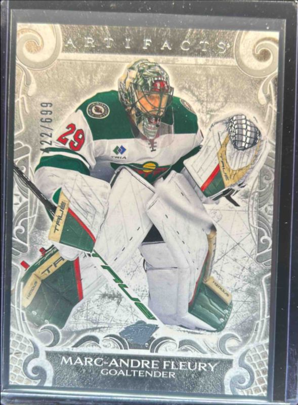 The Marc-Andre Fleury 2024 Upper Deck Artifacts #120 Silver /699 card is 1 of 32 Marc-Andre Fleury's card variations in the 2024 Upper Deck Artifacts set being tracked by Sports Card Investor, including Foilboard, Foilboard Gold, Neon Green, Plexi, and Ruby /399.