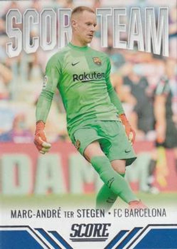 The Marc-Andre ter Stegen 2021 Score FIFA #8 Score Team card is 1 of 26 Marc-Andre ter Stegen's card variations in the 2021 Score FIFA set being tracked by Sports Card Investor, including Base, Red Laser, Red Lava, Orange Lava /99, and Blue Laser /49.