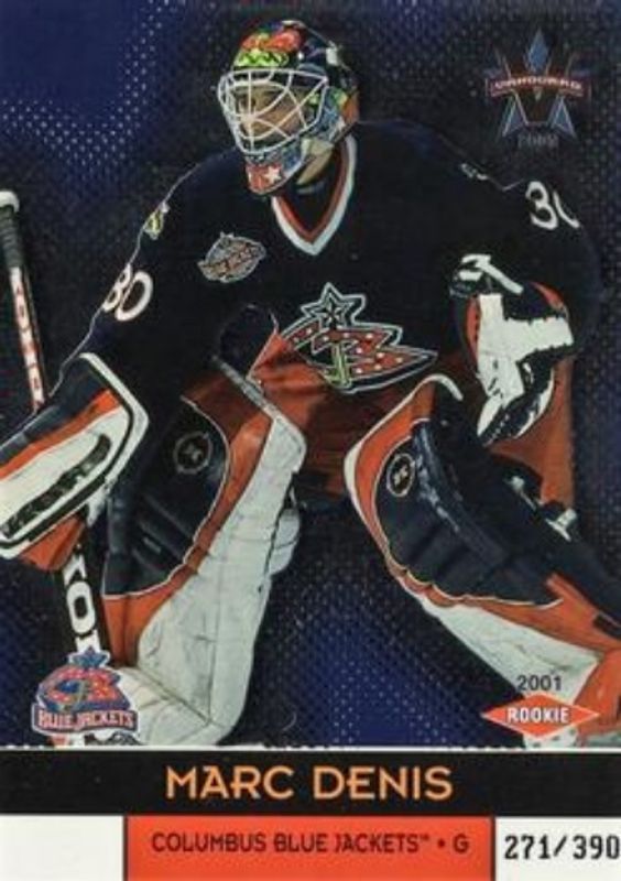 The Marc Denis 2000 Pacific Vanguard #113 Base /390 card is 1 of 2 Marc Denis' card variations in the 2000 Pacific Vanguard set being tracked by Sports Card Investor, including Pacific Proofs /1.