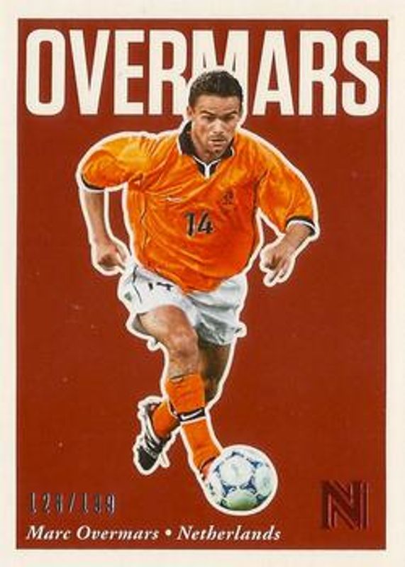 The Marc Overmars 2017 Nobility #58 Red /199 card is 1 of 14 Marc Overmars' card variations in the 2017 Nobility set being tracked by Sports Card Investor, including Base, Blue /99, Orange /75, Bronze /20, and Gold /10.