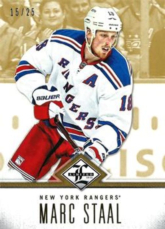 The Marc Staal 2012 Limited #119 Gold /25 card is 1 of 13 Marc Staal's card variations in the 2012 Limited set being tracked by Sports Card Investor, including Base /499, Silver /49, Emerald /5, Platinum /1, and Printing Plate Black /1.