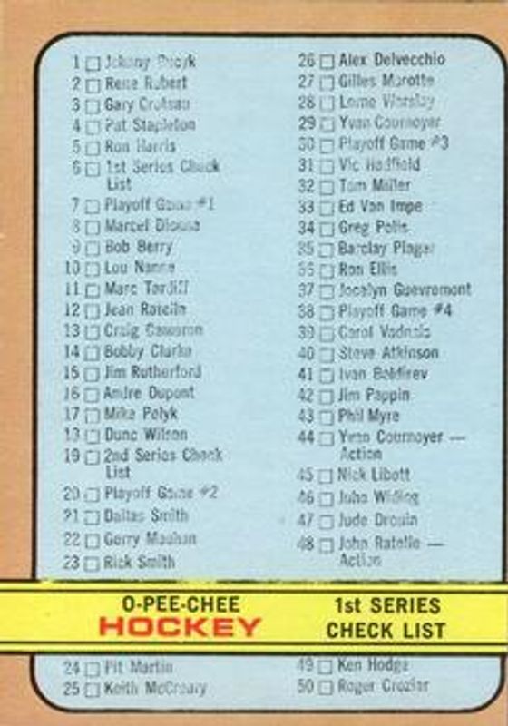 Other popular players in the 1972 O-Pee-Chee set include Alex Delvecchio, Bobby Clarke, Bobby Hull, Bobby Orr, and Brad Park.