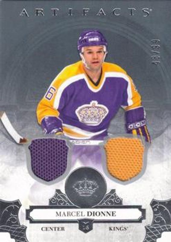 The Marcel Dionne 2017 Upper Deck Artifacts #144 Materials Silver /125 card is 1 of 15 Marcel Dionne's card variations in the 2017 Upper Deck Artifacts set being tracked by Sports Card Investor, including Base /799, Ruby /299, Auto Material Silver /99, Emerald /99, and Orange /55.