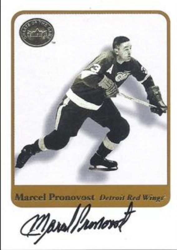 The Marcel Pronovost 2001 Fleer Greats of the Game Autographs card is 1 of 2 Marcel Pronovost's card variations in the 2001 Fleer Greats of the Game set being tracked by Sports Card Investor, including Base.