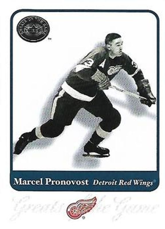 The Marcel Pronovost 2001 Fleer Greats of the Game #84 Base card is 1 of 2 Marcel Pronovost's card variations in the 2001 Fleer Greats of the Game set being tracked by Sports Card Investor, including Autographs.