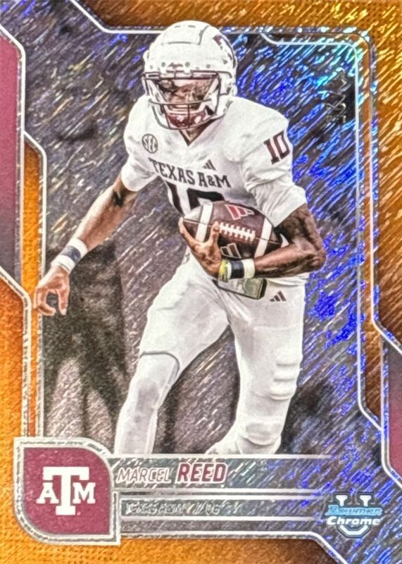 This card is 1 of 60 Marcel Reed's card variations in the 2025 Bowman Chrome University set being tracked by Sports Card Investor, including Yellow Mini-Diamond Refractor /350, Yellow Refractor /350, Aqua Mini-Diamond Refractor /325, Aqua Refractor /325, and Lime Green Mini-Diamond Refractor /275.