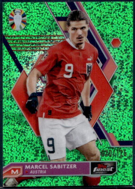 The Marcel Sabitzer 2023 Topps Finest Road to UEFA Euro #4 Green Speckle Refractor /125 card is 1 of 15 Marcel Sabitzer's card variations in the 2023 Topps Finest Road to UEFA Euro set being tracked by Sports Card Investor, including Base, Refractor, Blue Aqua Vaporwave Refractor /250, Blue Refractor /150, and Green Lava Refractor /99.