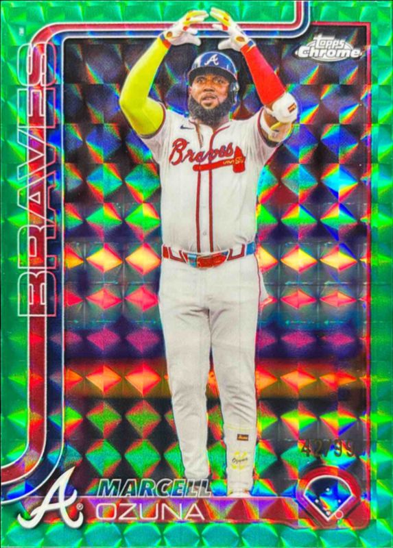 The Marcell Ozuna 2025 Topps Chrome #250 Green Geometric Refractor /99 card is 1 of 58 Marcell Ozuna's card variations in the 2025 Topps Chrome set being tracked by Sports Card Investor, including Base, Geometric Refractor, Lightboard Logo Variation, Negative Refractor, and Prism Refractor.