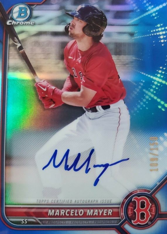 Best Prices Available For Sale of Marcelo Mayer 2022 Bowman #CPA-MMY Chrome Prospect Auto - Blue Refractor /150