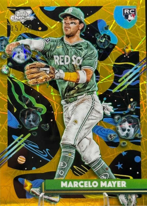 The Marcelo Mayer 2025 Topps Chrome Cosmic #91 Gold Interstellar Refractor /50 Rookie card in Raw condition has moved down -$12.50 (-11.1%) in the last 30 days and was last sold for $100.00 .