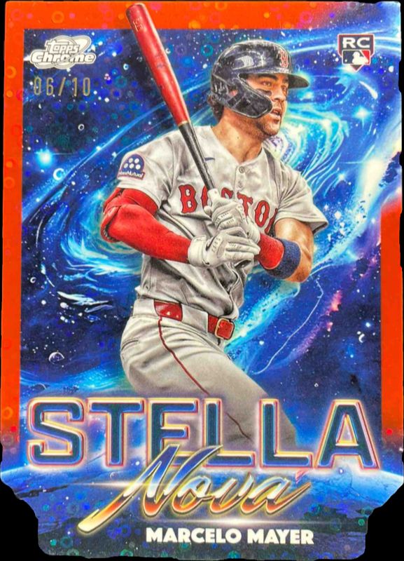 The Marcelo Mayer 2025 Topps Chrome Cosmic #SN-16 Stella Nova - Black Eclipse Refractor /10 Rookie card is 1 of 75 Marcelo Mayer's card variations in the 2025 Topps Chrome Cosmic set being tracked by Sports Card Investor, including Base, Nucleus Refractor, Refractor, Aqua Equinox Refractor /199, and Purple Nebula Refractor /150.