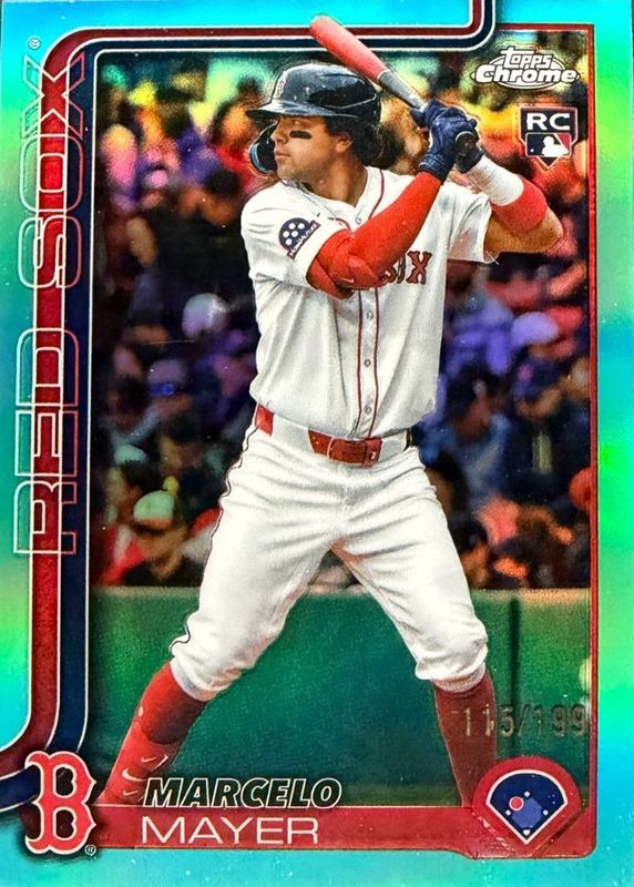 The Marcelo Mayer 2025 Topps Chrome Update #USC9 Aqua Refractor /199 Rookie card in Raw condition has moved down -$8.00 (-40.0%) in the last 30 days and was last sold for $12.00 .
