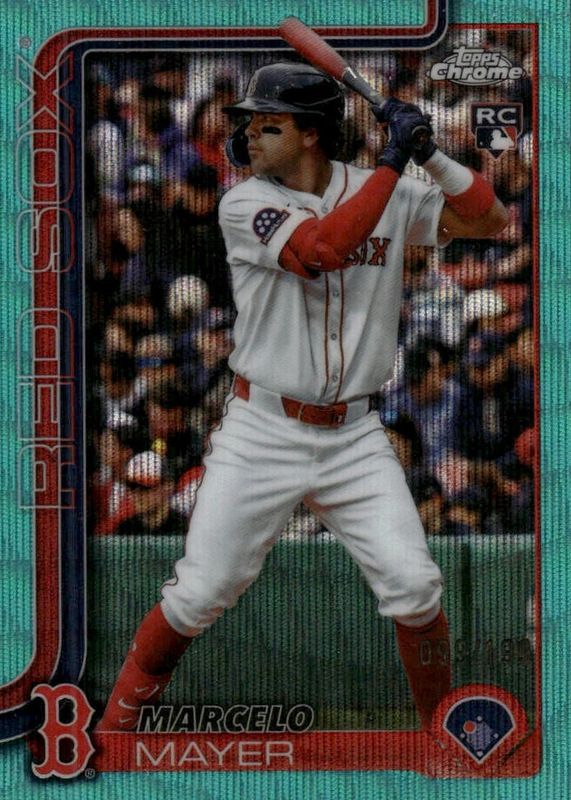The Marcelo Mayer 2025 Topps Chrome Update #USC9 Aqua Wave Refractor /199 Rookie card in Raw condition has moved down -$3.50 (-17.5%) in the last 30 days and was last sold for $16.50 .
