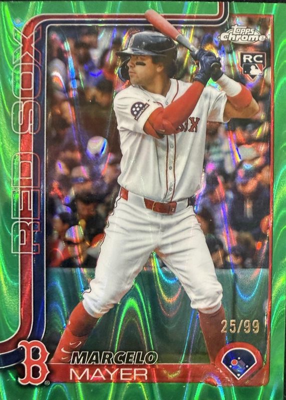 The Marcelo Mayer 2025 Topps Chrome Update #USC9 Green RayWave Refractor /99 Rookie card in Raw condition has not changed in price in the last 30 days and was last sold for $20.00 .