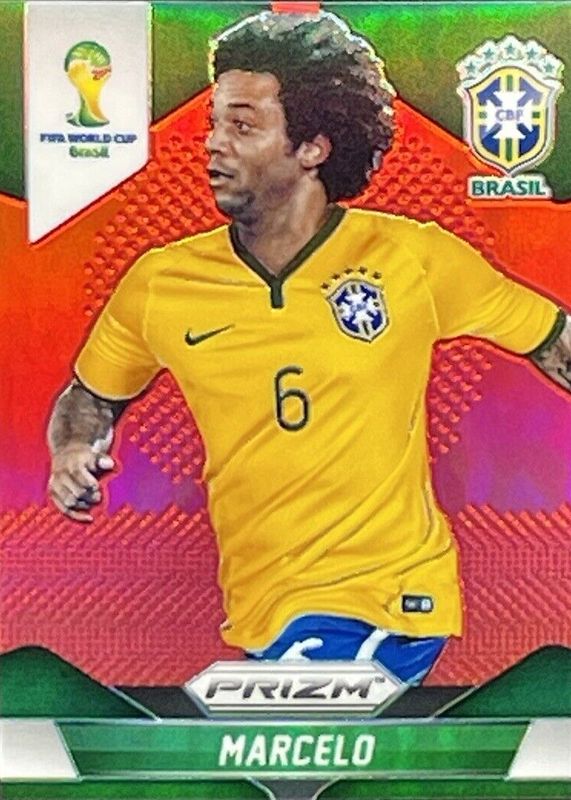 This card is 1 of 12 Marcelo's card variations in the 2014 Prizm World Cup set being tracked by Sports Card Investor, including Base, Blue & Red Wave, Red White Blue Power Plaid, Silver, and Yellow & Red Pulsar.