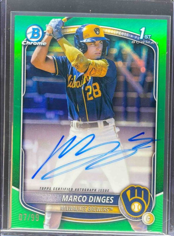 The Marco Dinges 2025 Bowman Chrome #CPA-MD Prospect Auto - Green Refractor /99 (1st) card in Raw condition has not changed in price in the last 30 days and was last sold for $55.00 .
