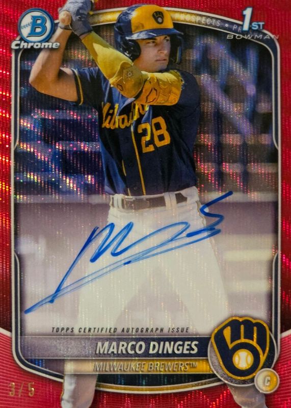 The Marco Dinges 2025 Bowman Chrome #CPA-MD Prospect Auto - Red Wave Refractor /5 (1st) card in Raw condition has not changed in price in the last 30 days and was last sold for $545.00 .