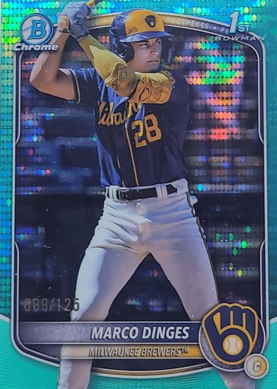The Marco Dinges 2025 Bowman Chrome #BCP-183 Prospects - Aqua Pulsar Refractor /125 (1st) card in Raw condition has not changed in price in the last 30 days and was last sold for $3.50 .