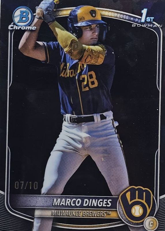 The Marco Dinges 2025 Bowman Chrome Sapphire Edition #BCP-183 Prospects - Black /10 (1st) card in Raw condition has not changed in price in the last 30 days and was last sold for $79.55 .