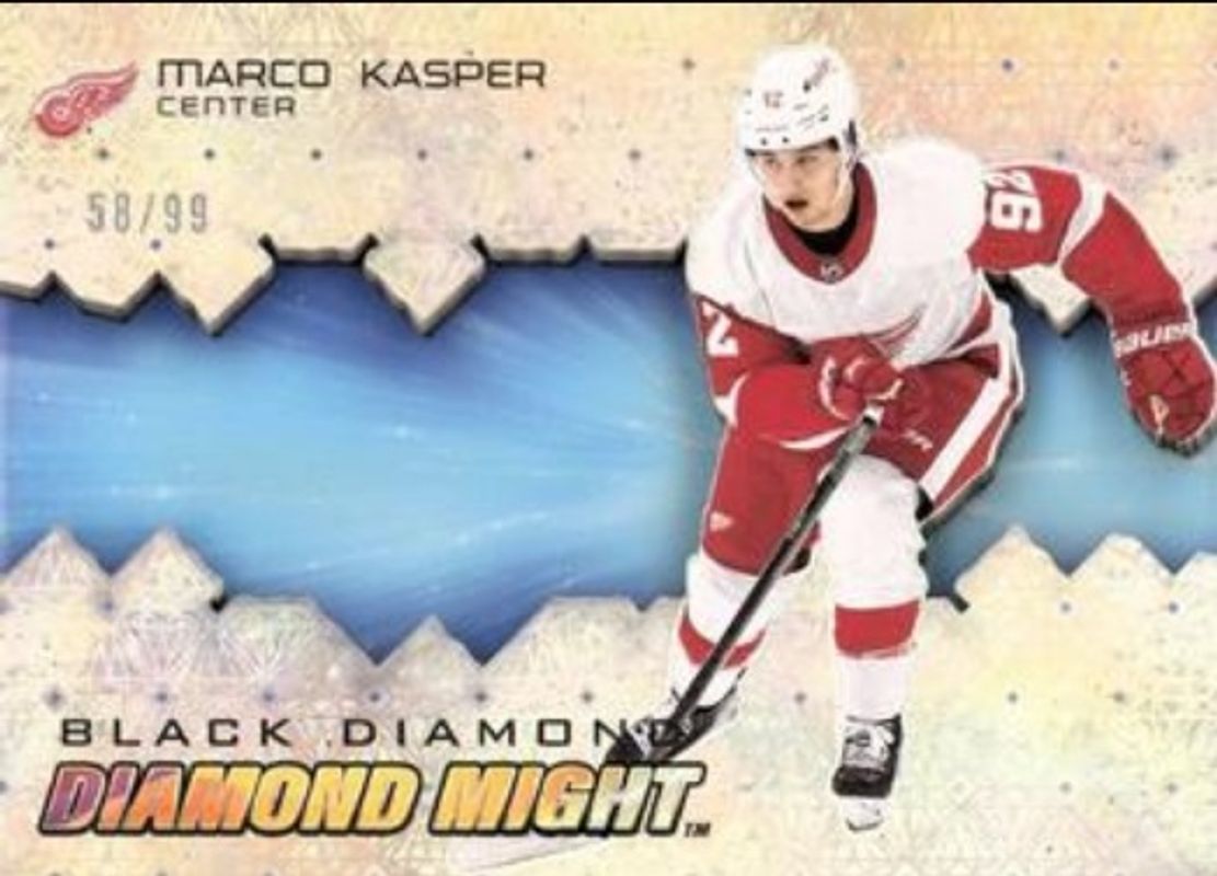 The Marco Kasper 2023 Upper Deck Black Diamond #DM-KA Diamond Might /99 Rookie card is 1 of 56 Marco Kasper's card variations in the 2023 Upper Deck Black Diamond set being tracked by Sports Card Investor, including Base /349, Red /75, Blue /25, Pure Black Auto /25, and Green /10.