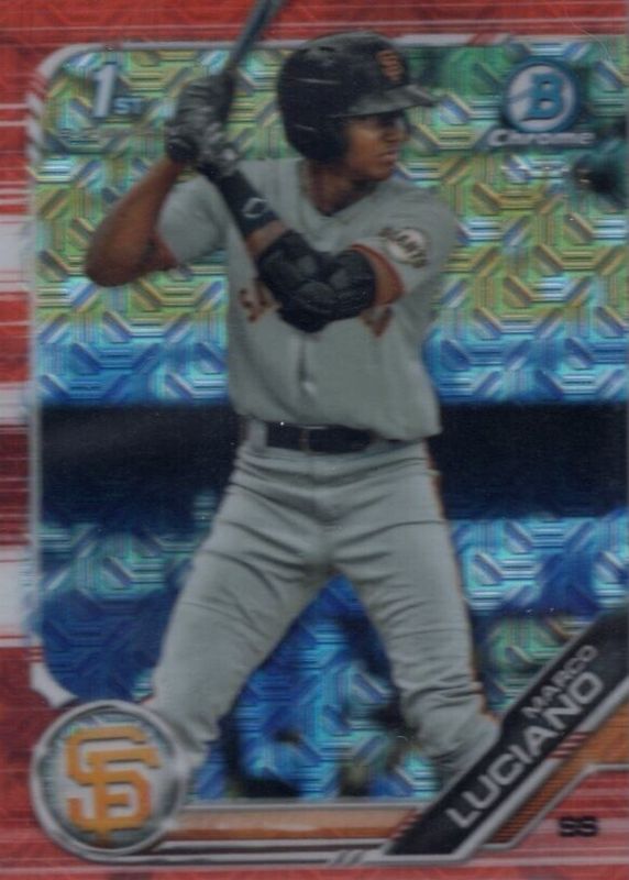 This card is 1 of 6 Marco Luciano's card variations in the 2019 Bowman Mega Box set being tracked by Sports Card Investor, including Chrome Prospects - Mojo Refractor (1st), Chrome Prospects - Purple Mojo Refractor /250 (1st), Chrome Prospects - Green Mojo Refractor /99 (1st), Chrome Prospects - Gold Mojo Refractor /50 (1st), and Chrome Prospects - Black Mojo Refractor /1 (1st).
