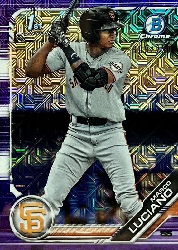 The Marco Luciano 2019 Bowman Mega Box #BCP-82 Chrome Prospects - Purple Mojo Refractor /250 (1st) card in Raw condition has not changed in price in the last 30 days and was last sold for $6.99 .