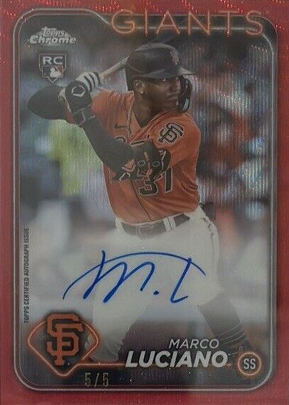 Auctions Ending Soon for Marco Luciano 2024 Topps Chrome #RA-ML Rookie Autographs - Red Wave Refractor /5 SGC 9.5