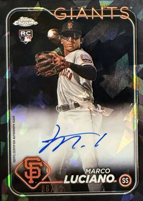 This card is 1 of 14 Marco Luciano's card variations in the 2024 Topps Chrome Update Sapphire Edition set being tracked by Sports Card Investor, including Rookie Debut, Rookie Debut - Gold /50, Rookie Debut - Orange /25, Rookie Debut - Black /10, and Rookie Debut - Red /5.