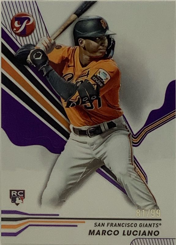 The Marco Luciano 2024 Topps Pristine #176 Pristine Purple Refractor /99 Rookie card is 1 of 23 Marco Luciano's card variations in the 2024 Topps Pristine set being tracked by Sports Card Investor, including Base, Pristine Refractor, Refractor, Green Refractor /150, and Purple Refractor /99.