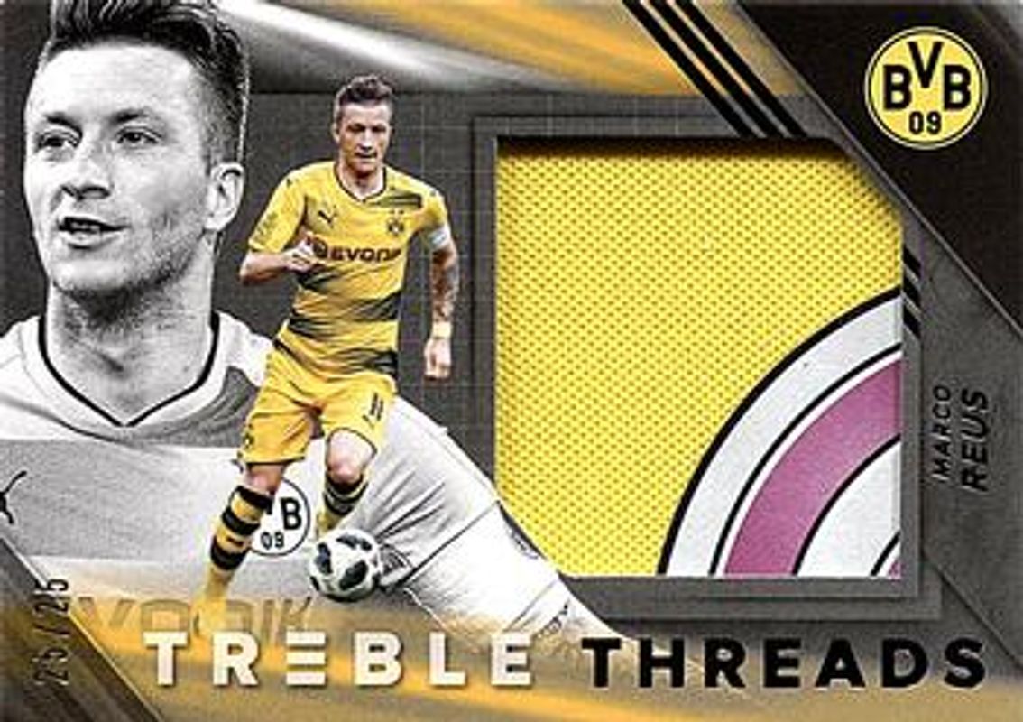 The Marco Reus 2018 Treble #TT-MR Treble Threads /99 card is 1 of 17 Marco Reus' card variations in the 2018 Treble set being tracked by Sports Card Investor, including Base, Blue /75, Purple /49, Gold /25, and Green /10.