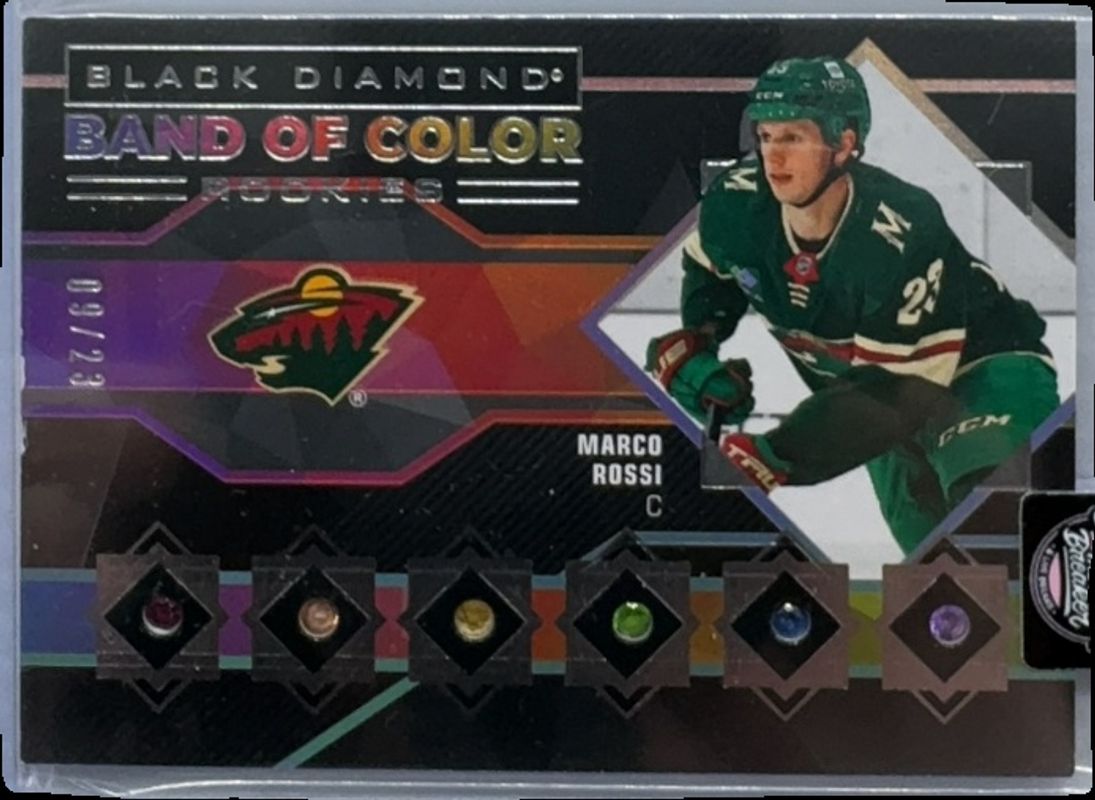 The Marco Rossi 2022 Upper Deck Black Diamond #BCR-MR Band of Color Rookies Diamond 6 /23 card is 1 of 38 Marco Rossi's card variations in the 2022 Upper Deck Black Diamond set being tracked by Sports Card Investor, including Base /349, Diamond Relic Rookie Gems /99, Red /75, Diamond Relic Rookie Gems Ruby /49, and Blue /25.