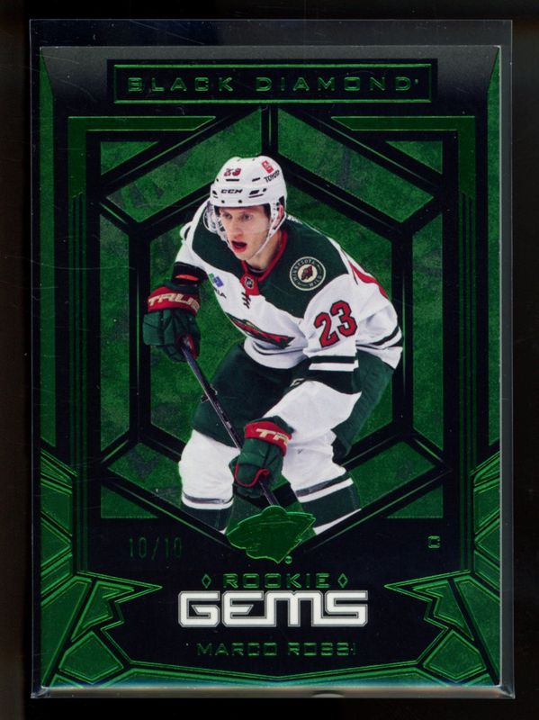 The Marco Rossi 2022 Upper Deck Black Diamond #RG-MR Rookie Gems /399 card is 1 of 38 Marco Rossi's card variations in the 2022 Upper Deck Black Diamond set being tracked by Sports Card Investor, including Base /349, Diamond Relic Rookie Gems /99, Red /75, Diamond Relic Rookie Gems Ruby /49, and Blue /25.