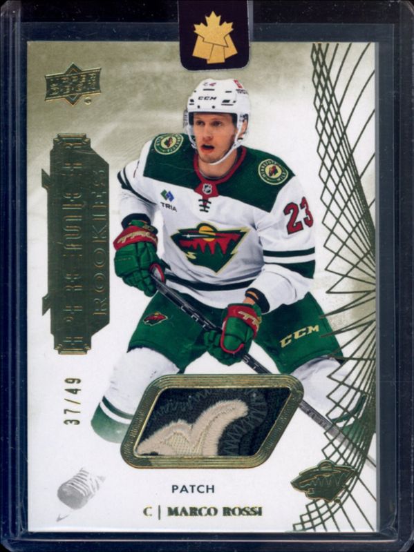 The Marco Rossi 2022 Upper Deck Premier #142 Premium Memorabilia /49 Rookie card is 1 of 40 Marco Rossi's card variations in the 2022 Upper Deck Premier set being tracked by Sports Card Investor, including Base /399, Autographs, Jersey, Rookies Bronze /199, and Gold /65.