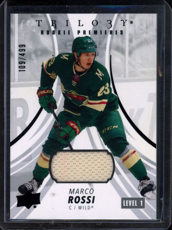 The Marco Rossi 2022 Upper Deck Trilogy #141 Black Foil Memorabilia /499 Rookie card is 1 of 38 Marco Rossi's card variations in the 2022 Upper Deck Trilogy set being tracked by Sports Card Investor, including #191 Base /699, #241 Base /699, #141 Base /699, #191 Black Foil Memorabilia /499, and #241 Black Foil Memorabilia /499.