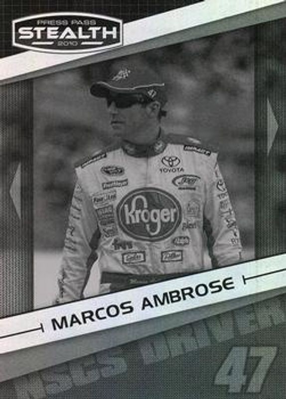 The Marcos Ambrose 2010 Press Pass Stealth #2 Black & White card is 1 of 8 Marcos Ambrose's card variations in the 2010 Press Pass Stealth set being tracked by Sports Card Investor, including #2 Base, #83 Base, #83 Black & White, #2 Purple /25, and #2 eBay Previews /5.
