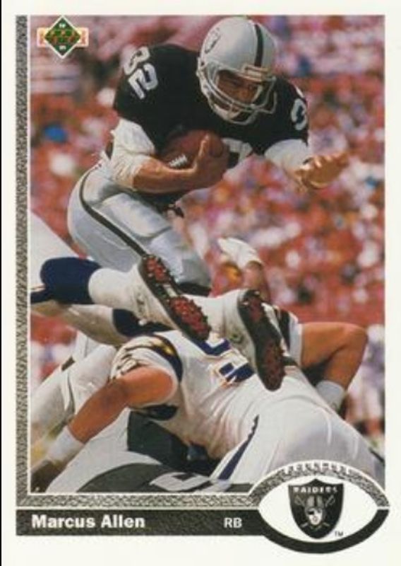 The Marcus Allen 1991 Upper Deck #446 Base card is 1 of 2 Marcus Allen's card variations in the 1991 Upper Deck set being tracked by Sports Card Investor, including Game Breakers.