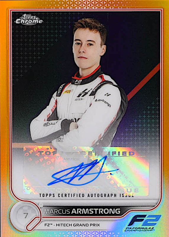 This card is 1 of 7 Marcus Armstrong's card variations in the 2022 Topps Chrome Formula 1 set being tracked by Sports Card Investor, including Autographs, Autographs - Green Refractor /99, Autographs - Gold Refractor /50, Autographs - Gold Wave Refractor /50, and Autographs - Red Refractor /5.