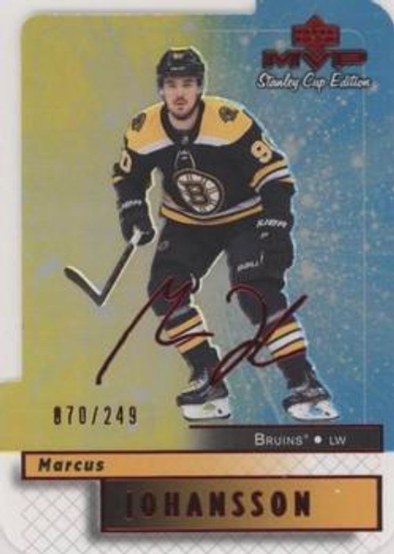 The Marcus Johansson 2019 Upper Deck MVP #8 Stanley Cup Edition 20th Anniversary Colors & Contours /249 card is 1 of 16 Marcus Johansson's card variations in the 2019 Upper Deck MVP set being tracked by Sports Card Investor, including Base, Blue, Gold Script, Puzzle Backs, and Silver Script.