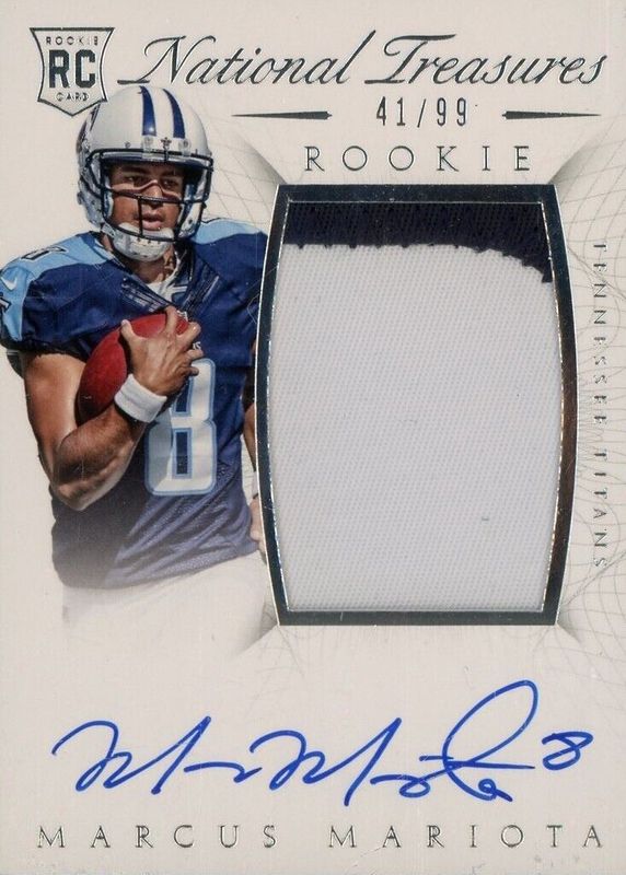 This card is 1 of 9 Marcus Mariota's card variations in the 2015 National Treasures set being tracked by Sports Card Investor, including Rookie Patch Auto - Numbers Green (/8), Rookie Patch Auto - Silver /25, Rookie Patch Auto - Gold /10, Rookie Patch Auto - Black /5, and Rookie Patch Auto - Red Laundry Tag /3.
