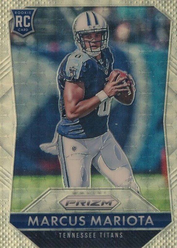 This card is 1 of 16 Marcus Mariota's card variations in the 2015 Prizm set being tracked by Sports Card Investor, including Base, Blue, Green, Red, and Red White Blue.
