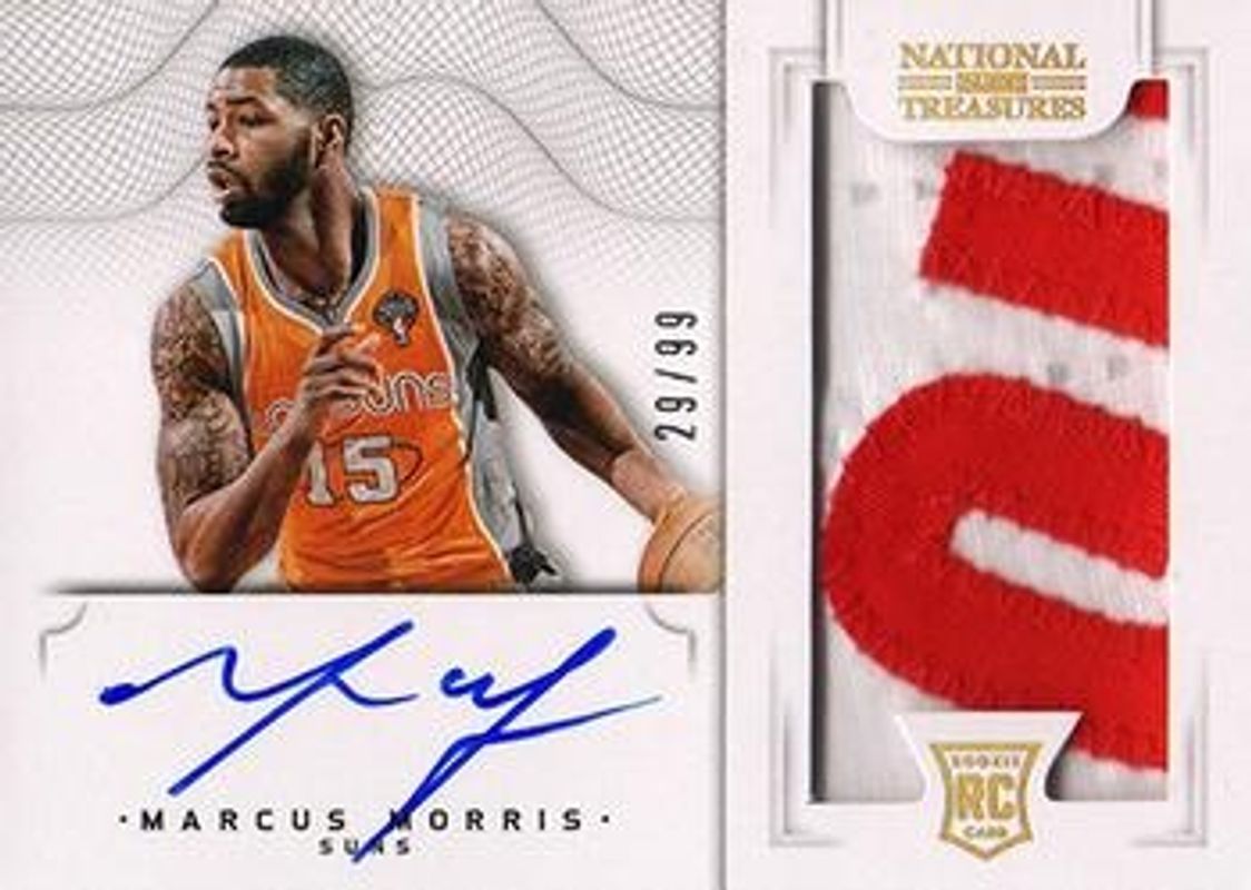 The Marcus Morris 2012 National Treasures #113 Base /99 Rookie card is 1 of 9 Marcus Morris' card variations in the 2012 National Treasures set being tracked by Sports Card Investor, including Rookie Patch Auto /99, Rookie Patch Auto - Jersey Number Prime /25, Rookie Patch Auto - Gold /5, Printing Plates Black /1, and Printing Plates Cyan /1.
