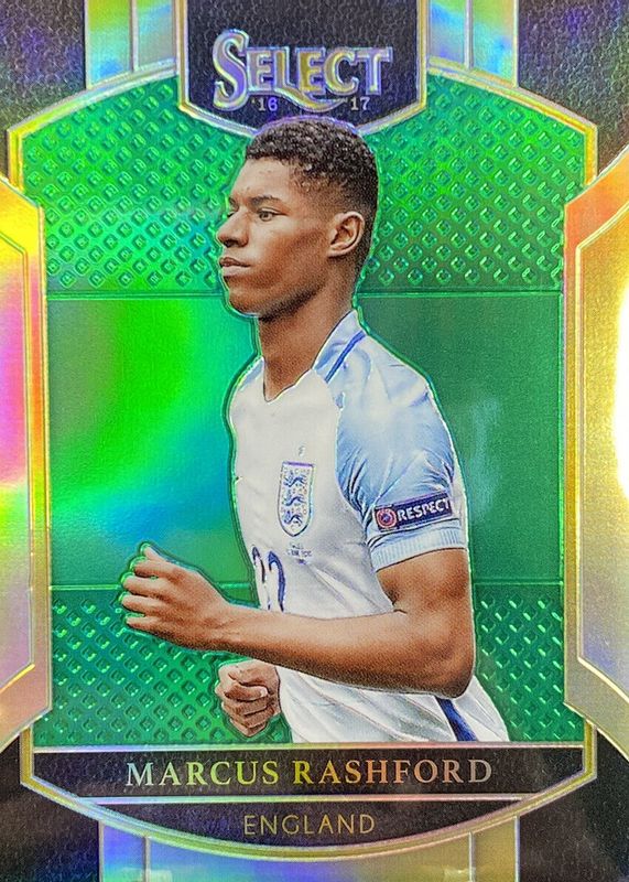 The Marcus Rashford 2016 Select #77 Terrace Green /5 Rookie card in Raw condition has not changed in price in the last 30 days and was last sold for $937.00 .